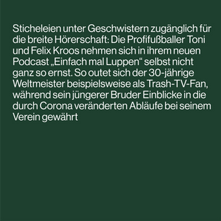 Den Anfang hat letzte Woche "11 Leben", ein Podcast über Uli Hoeneß von Max-Jakob Ost vom Rasenfunk gemacht, diese Woche ist es "Einfach mal Luppen" von den Kroos-Brüdern. Auch nächste Woche stellen wir euch wieder einen spannenden und unterhaltsamen Podcast vor, also seid dabei, folgt uns auf den sozialen Netzwerken und verpasst nichts!